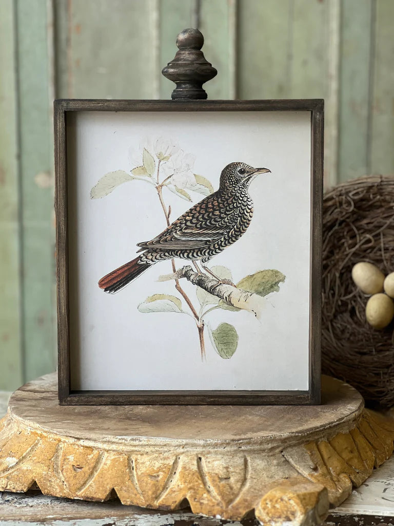 Allow this beautifully feathered flock to perch in your shop! Stunning birds in soft shades are framed in a rustic frame topped with most charming finial for an extra element of interest. Dimensions: 11.25" x 16"