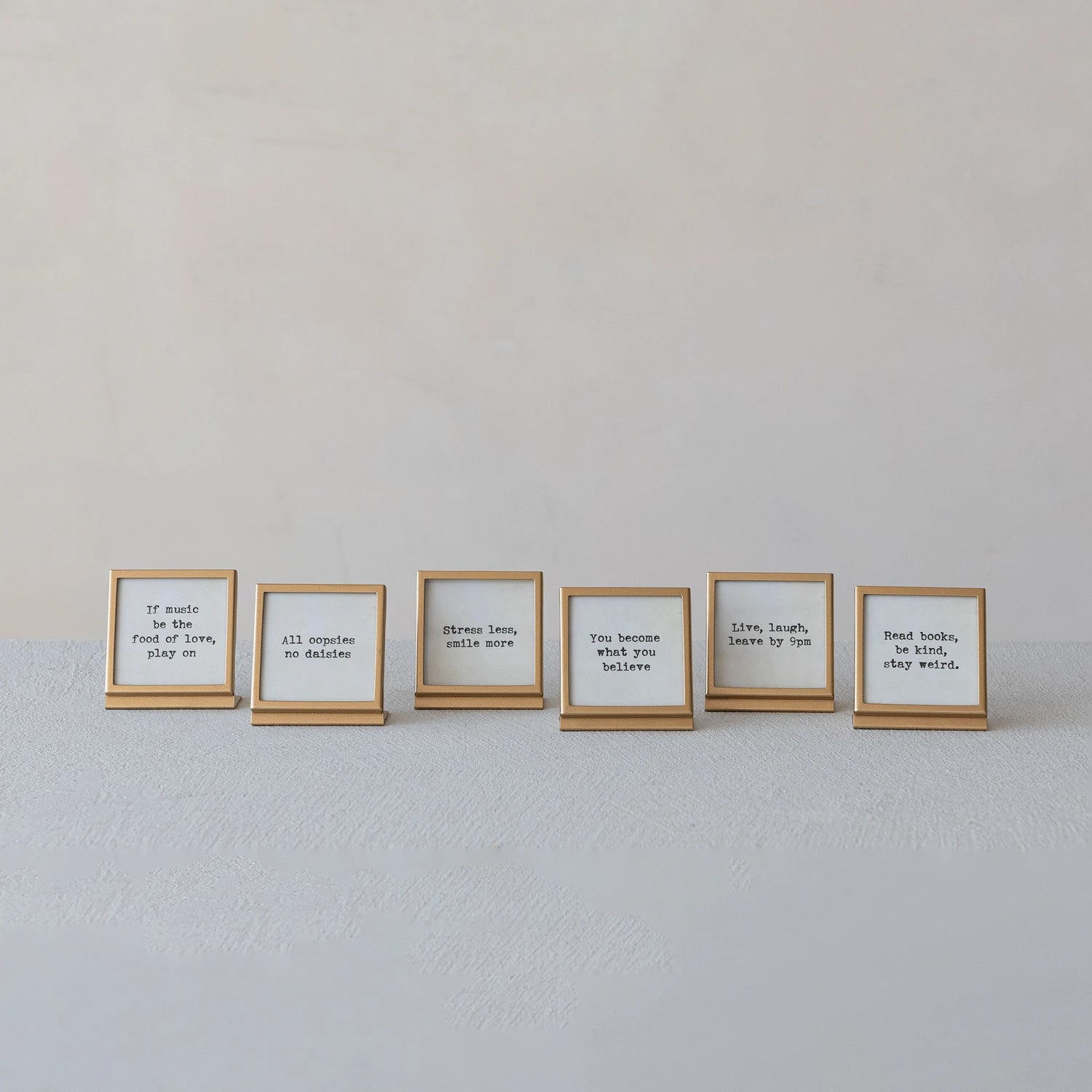 Square metal and glass frame easel and saying with gold finish. Available in six styles, sold separately! 3"