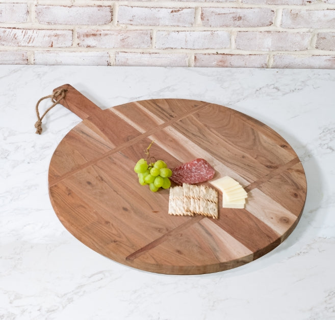 Serve up some serious style with our Round Wood Serving Board! Made from high-quality wood, this board is perfect for all your entertaining needs. Whether you're hosting a party or just serving up some snacks, this round board adds a touch of elegance to any occasion. Dimensions: 28 x 22.5 x 1