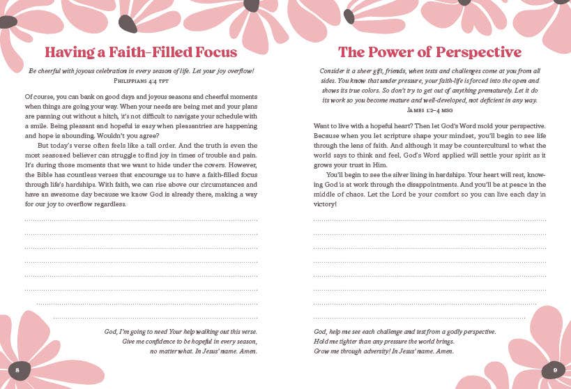 Good days have many things in common: joy, blessings, wonder, delight, contentment. . .but the very best days are those that include God in the details. Your Best Day Devotional Journal provides much-needed encouragement and inspiration for your soul. With each turn of the page, you will encounter a lovely design alongside faith-building, biblically based devotions and related scripture selections. Touching on topics like stress, joy, emotions, rest, relationships, freedom, and more, these 180 readings will help you discover that your very best day always begins—and ends—in conversation with your heavenly Father.